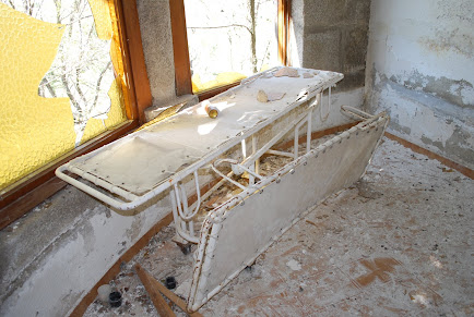 Entramos a través de lo que con posterioridad pudimos saber que constituía el velatorio, donde se colocaba el féretro para recibir visitas, accediendo a una pequeña sala semicircular con cristales rotos de tono amarillento en la que se encontraban dos camillas abandonadas. Si hubiéramos sabido que el destino de aquella sala fue el señalado, probablemente no hubiéramos dejado allí nuestra grabadora…...