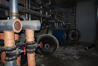 Una puerta de difícil acceso (los escombros dificultan alcanzarla)nos introduce en una amplia sala con vitrinas de madera que al parecer se utilizaba como farmacia. Desde allí, hacia el oscuro corazón del gigante. Primero hacia abajo, alcanzando a un recinto que albergó la cocina. Vemos las cámaras frigoríficas y las calderas, estas últimas realmente impresionantes. No podemos sino acordarnos de algunas escenas de “Pesadilla en Elm Street”.