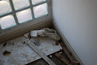 Llegamos a la planta 6ª, la más deteriorada de todas. El techo se esta desplomando. Avanzamos con extraordinario cuidado, tomamos algunas instantáneas y comenzamos el regreso. Al bajar por las escaleras centrales, llenas de cristales y escombros, justo cuando alcanzamos la altura de la segunda planta, ¡observamos atónitos como una puerta se cierra a nuestras espaldas con un sonoro golpe! Esta vez la sorpresa la adjudicamos al aire pero ¿Por qué solo una puerta cuando al girarnos vemos otras tres abiertas?...y aún más, ¿ como es posible que puertas llenas de escombros que llevan años sin cerrarse puedan de repente girar de esa manera?